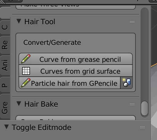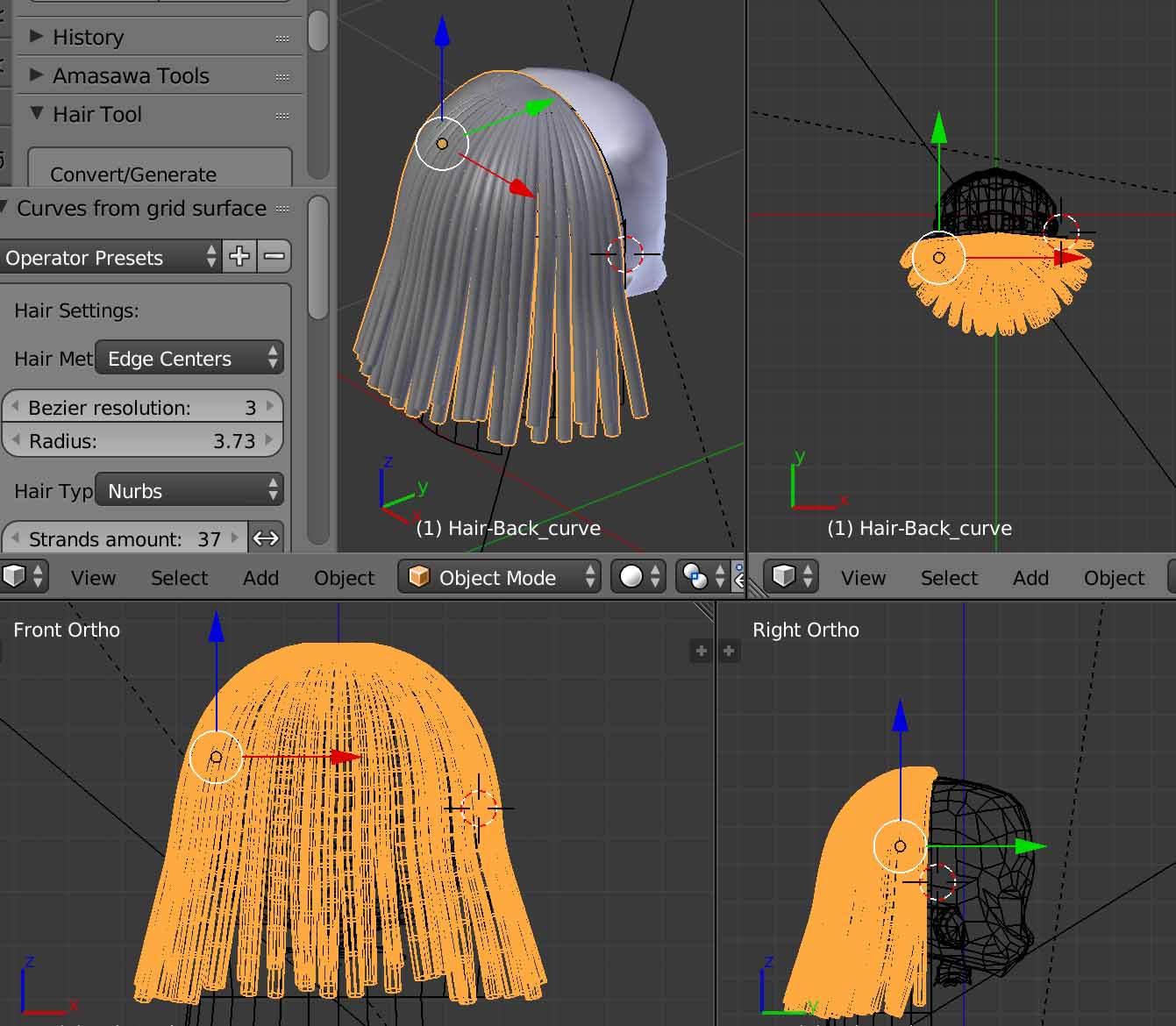 1. 髪を作りたい形状のメッシュを用意 2. 髪の生える根元をEdgeでSharpに 3. Objectモードで「Tool」タブ→「Curves from grid surface」 4. あとはプロパティで調整 5. 生成されたメッシュ自体はCurveなのでパスで調整。