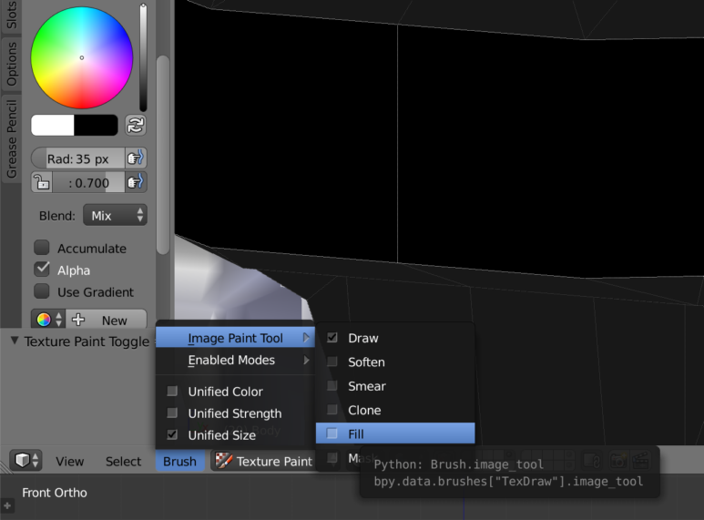- 「TexturePaint」モードに入ってheaderの「Brush」→「Image Paint Tool」→「Fill」に