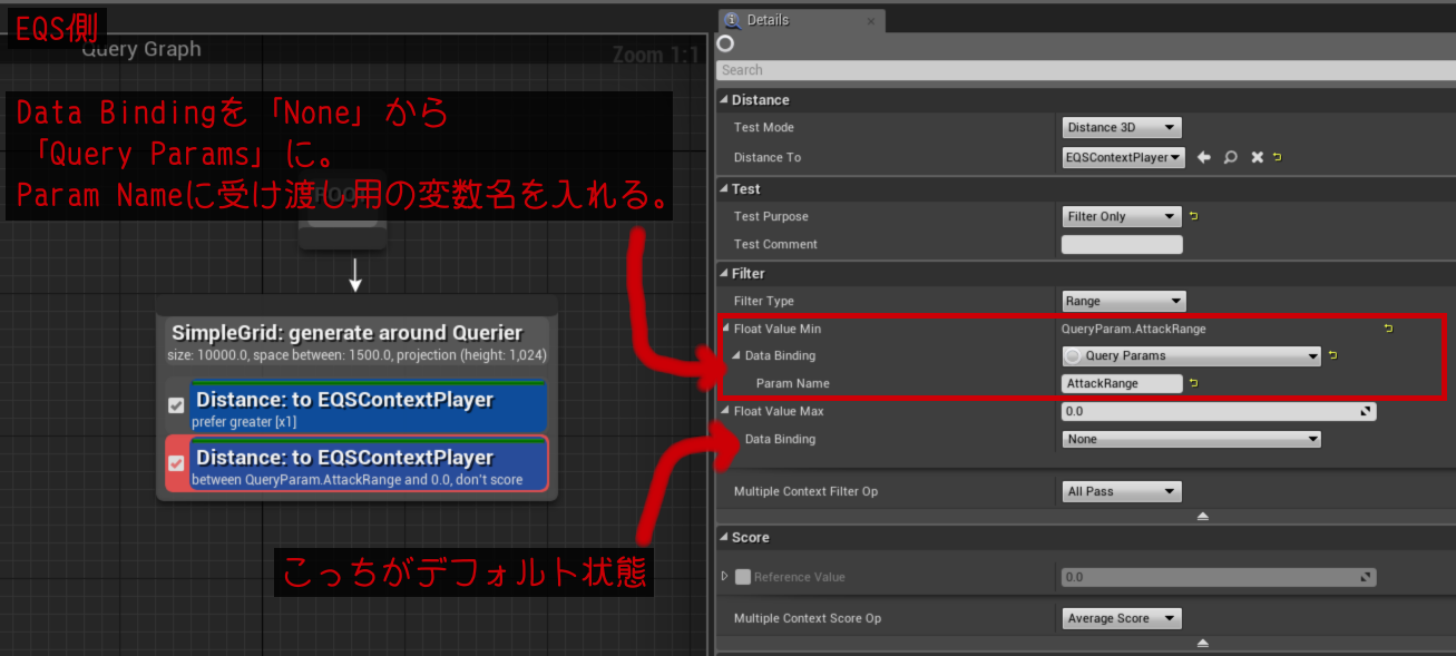 上記を解消した自作クラスを用意してみた ジェネレーター †composite †テストを複数のジェネレーターで計算した結果を返す。 テスト †clamp †テスト対象が複数あった場合の合成方法 †QueryContextが複数有る場合。 「Trace」でItemと指定したオブジェクトとの間の遮蔽物をtestする †自作する(C++) †Behavior Tree †Behavior Treeとの変数の受け渡し †