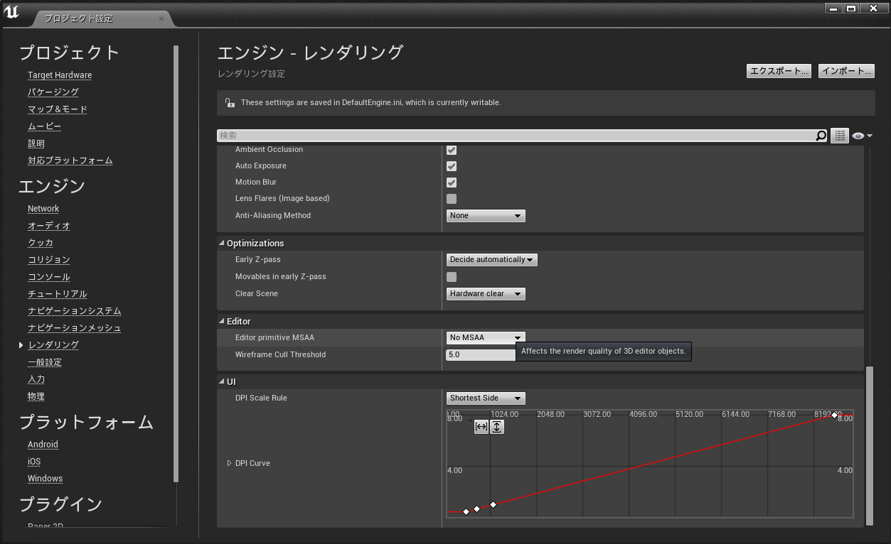 メニューバーの「編集」-「プロジェクト設定」、「エンジン」欄「レンダリング」の「Editor」欄「Editor primitive MSAA」を「No MSAA」に