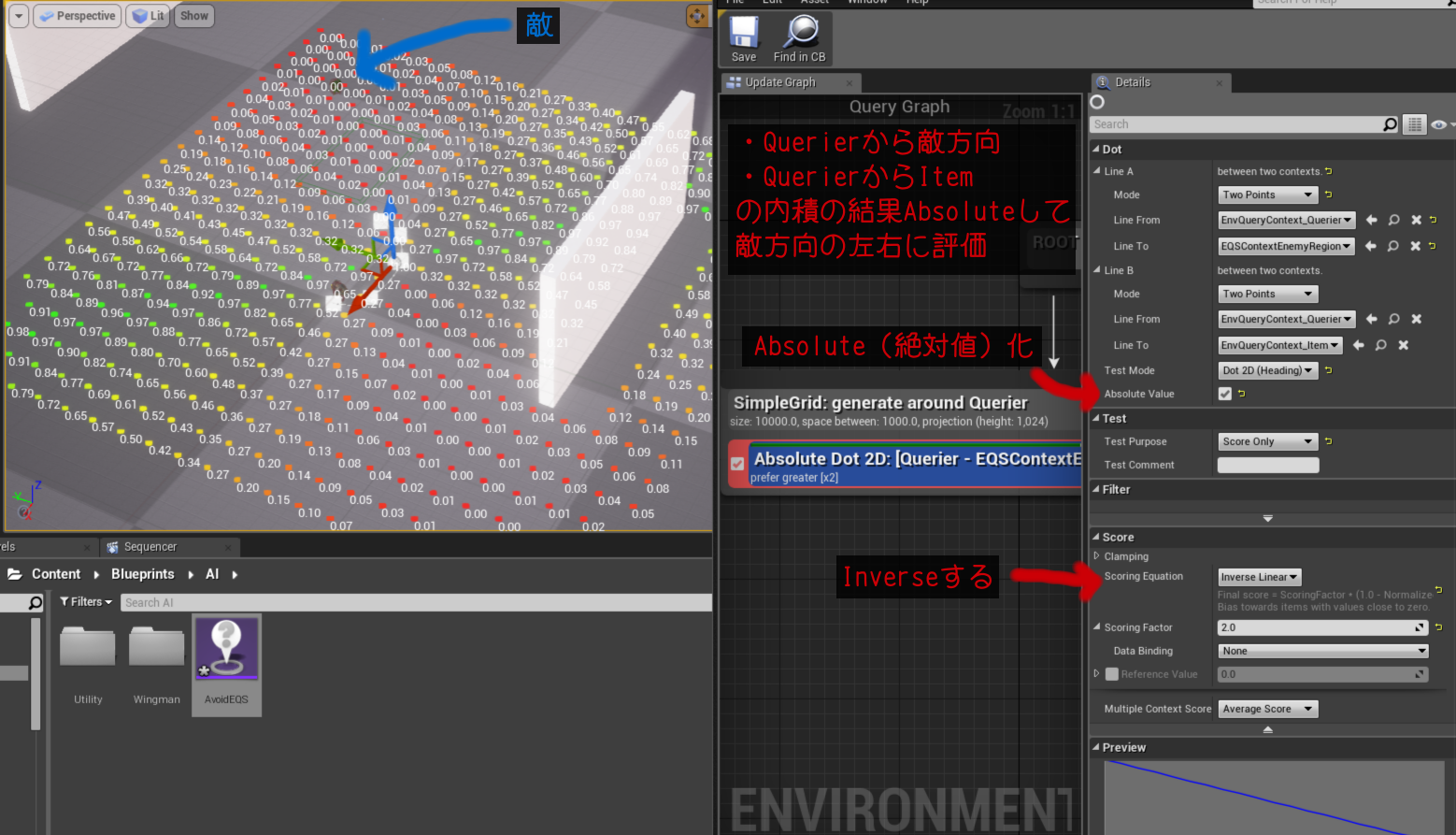 - 数値の可視化。「EQSTestingPawn」を継承したアクターをシーンに配置。